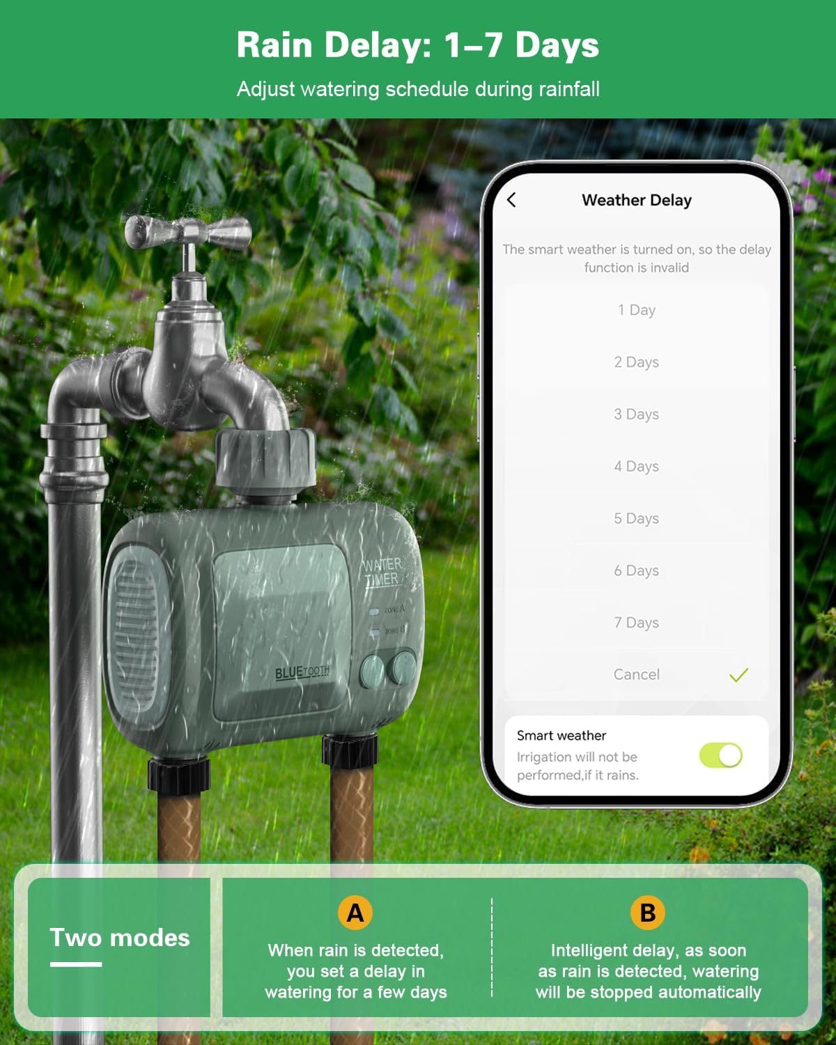 Our 2025 upgraded hose timer is easy to use and have auto, manual and rain delay modes to meet all your watering needs. Our water timer is fantastic for it's WiFi-enabled and compatible with Alexa and Google. The two-zone functionality and multiple watering patterns make garden maintenance a breeze. Ideal for outdoor gravity drip irrigation, garden hose watering, lawn sprinkler controller, greenhouse mist system, pool filling, birdbath dripper, pet drinking, etc.
